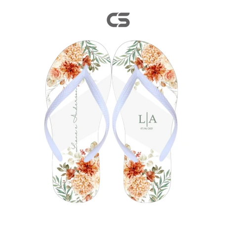 Chinelo Personalizado Flores Laranja Casamento Nomes dos Noivos Correias Coloridas